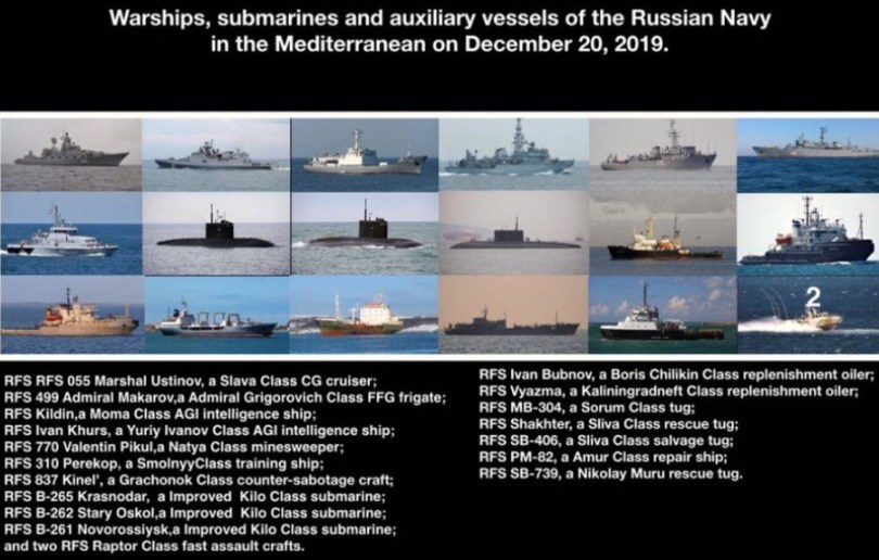 Potrivit sursei, pe 20.12.2019, în Marea Mediterană, se aflau 19 nave de luptă și auxiliare aparținând Forțelor Navale ale Federației Ruse, inclusiv trei submarine.