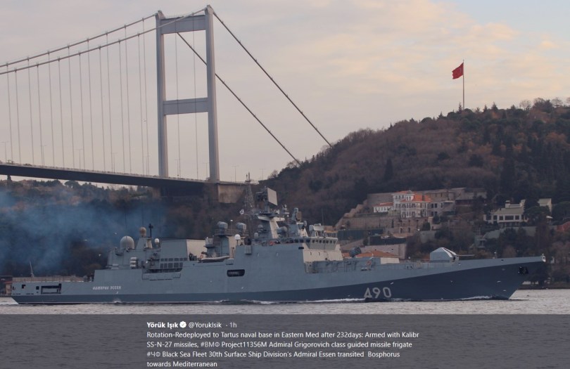 Departamentul asigurare informațională al Flotei ruse din Marea Neagră (FRMN) a anunțat că, pe 21.12.2019, fregata Amiral Essen, dotată cu rachete de croazieră Kalibr, a început deplasarea de la Sevastopol către Marea Mediterană.