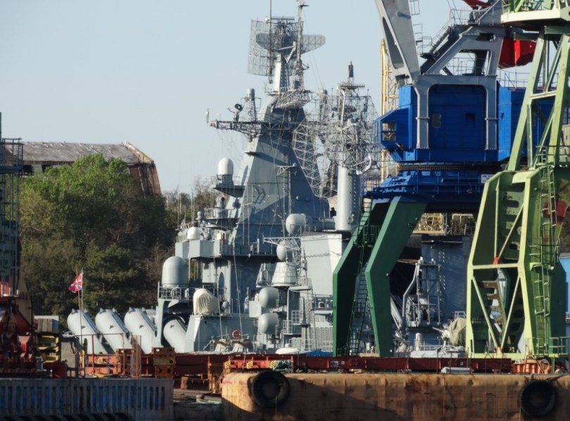 Este interesant de remarcat faptul că nava se află pentru a doua oară la docul uscat al societății Complexul Naval Industrial. În cadrul pregătirilor pentru executarea unui marș de instrucție în Oceanul Indian, crucișătorul a fost adus la docul societății în anul 2003. La acea vreme, societatea Complexul Naval Industrial era singura din Sevastopol capabilă să asigure repararea navei. Docul de bază PD-30 al Șantierului Naval numărul 13 a fost dat în exploatare în anul 2018.