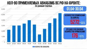 Potrivit unor statistici prezentate de Statul Major General (SMG) al Forțelor Armate ale Ucrainei, în luna aprilie a acestui an, Forțele Aerocosmice ale Federației Ruse au lansat 5.272 de bombe de aviație asupra unor ținte de pe teritoriul ucrainean. Această cifră este cea mai mare de la începutul invaziei militare rusești.