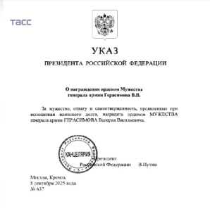 Agenția de presă rusă Tass a informat, pe 08.09.2025, că, prin decret prezidențial, președintele Vladimir Putin i-a acordat Ordinul Curajului generalului de armată Valeri Gherasimov, care îndeplinește funcția de șef al Statului Major General (SMG) al Forțelor Armate (FA) ruse și prim-adjunct al ministrului apărării.
